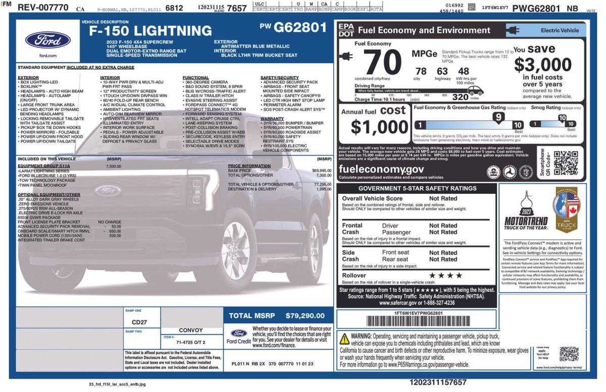 Elevate your driving experience with the 2023 Ford F-150 Lightning Pro, a remarkable electric powerhouse that redefines the boundaries of capability and innovation. This exceptional vehicle is more than just a pickup – it's a testament to Ford's commitment to delivering uncompromising performance and cutting-edge technology.- Twin panel moonroof- EQUIPMENT GROUP 511A HIGH, including 2nd Row Heated Seats, Tow Technology Package, smart hitch, on-board scales and trailer reverse guidance, Pro Trailer Hitch Assist, Trailer Brake Controller, Pro Trailer Backup Assist, Ford BlueCruise 1.0, phone as a key, Active Park Assist 2.0, and more- Tow Technology Package- Forward Sensing System, Manual-Folding Power Glass Heated Mirrors, 360 Degree Camera, Navigation System, Pro Trailer Backup Assist, Pro Trailer Hitch Assist, Trailer Brake ControllerThis F-150 Lightning Pro is more than just a workhorse; it's a versatile companion that seamlessly blends power, efficiency, and cutting-edge features. Boasting an impressive 78 MPGe in the city and 63 MPGe on the highway, this electric marvel delivers exceptional performance without compromising on fuel economy.Beneath the sleek exterior lies a true powerhouse, with a dual electric motor and extended-range high-voltage battery that provide exceptional capability. With 4WD and a host of advanced towing technologies, this Lightning Pro is ready to tackle any task with ease, whether it's hauling heavy loads or navigating challenging terrain.But the F-150 Lightning Pro is more than just a powerful vehicle; it's a technological marvel that redefines the driving experience. The SYNC 4 infotainment system, with enhanced voice recognition, puts a world of connectivity and convenience at your fingertips. The 360-degree camera and Pro Trailer Backup Assist make maneuvering and towing a breeze, while the Ford BlueCruise 1.0 autonomous driving system offers a new level of confidence on the open road.Step into the future of pickup trucks with the 2023 Ford F-150 Lightning Pro. This exceptional vehicle combines uncompromising performance, advanced technology, and a refined, comfortable interior to deliver an unparalleled driving experience. Experience the power and innovation of the F-150 Lightning Pro – it's the perfect companion for your next adventure.