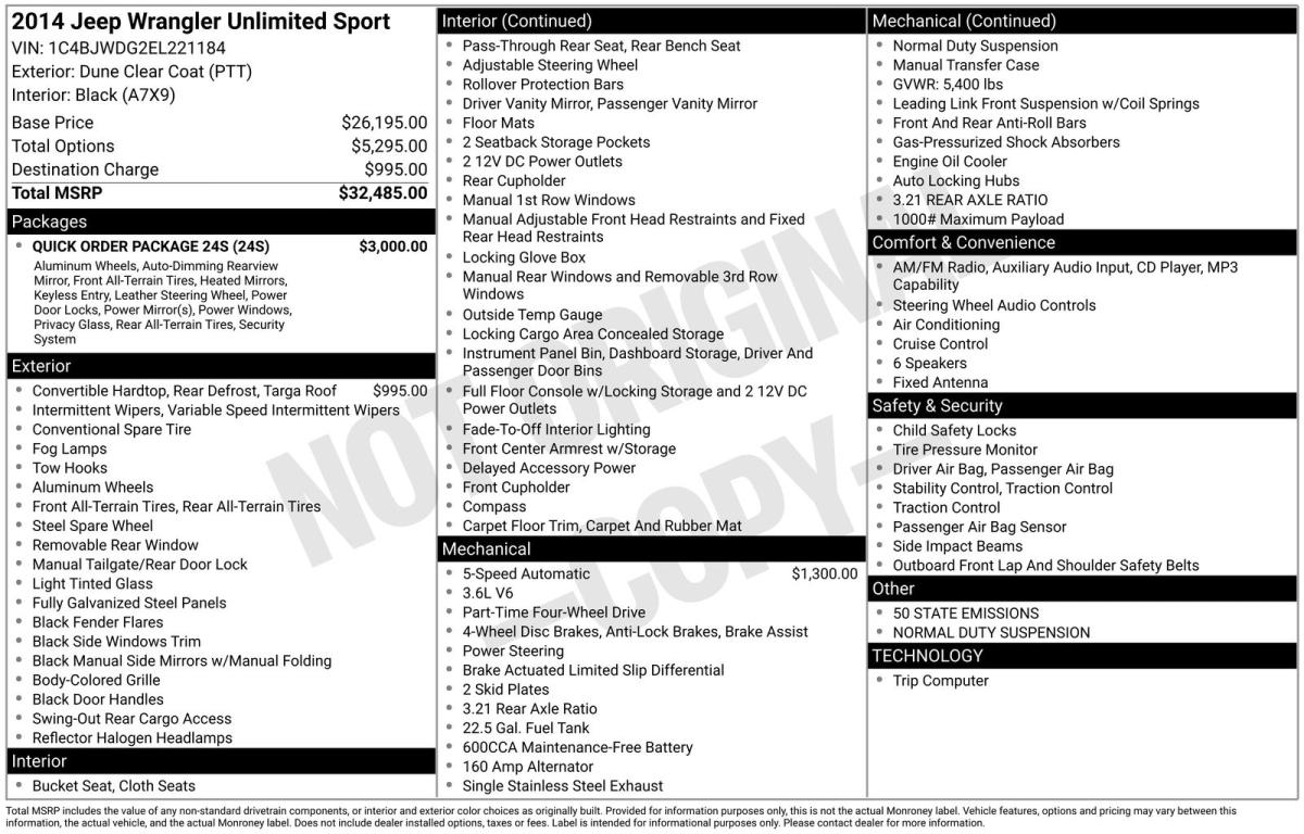 The 2014 Jeep Wrangler Sport is built for adventure, offering legendary off-road capability combined with rugged styling and open-air freedom that few vehicles can match.At its core, this Wrangler is powered by a proven 3.6L V6 engine paired with a capable 4x4 drivetrain and manual transfer case delivering the torque and control needed to tackle trails, mud, snow, or rocky terrain with confidence. With features like skid plates, heavy-duty suspension, and a solid axle setup, this Jeep is engineered to go where most vehicles simply cant.What truly sets this Wrangler apart is its off-road-focused equipment and unique customization options. The included Quick Order Package and Power Convenience Group elevate everyday usability with modern essentials like power windows, locks, heated mirrors, and remote keyless entry bringing comfort to a purpose-built machine.This model is also equipped with sought-after Jeep features that enhance both capability and lifestyle appeal:Black 3-piece hard top for durability and weather protectionRemovable Freedom panels for open-air driving on demand17-inch aluminum wheels wrapped in all-terrain/off-road tiresHill Descent Control for added confidence on steep declinesTrailer sway control for improved towing stabilityInside, the Wrangler maintains its functional, adventure-ready design with durable cloth bucket seats, a leather-wrapped steering wheel, and ample storage options. The Uconnect audio system with steering wheel controls keeps you connected while you explore off the beaten path.On the exterior, iconic Jeep styling shines through with bold fender flares, a full-size spare tire, tow hooks, and a commanding stance that signals capability from every angle.Additional highlights include:Part-time four-wheel drive with locking hubsHeavy-duty suspension and 3.21 rear axle ratio5-speed automatic transmission for easy drivabilitySunrider soft top functionality alongside the hard top optionConvertible design with removable doors and roofWith its unmatched off-road heritage, open-air versatility, and rugged build, this 2014 Jeep Wrangler Sport stands out as the ultimate vehicle for drivers who crave freedom, adventure, and capability beyond the pavement.