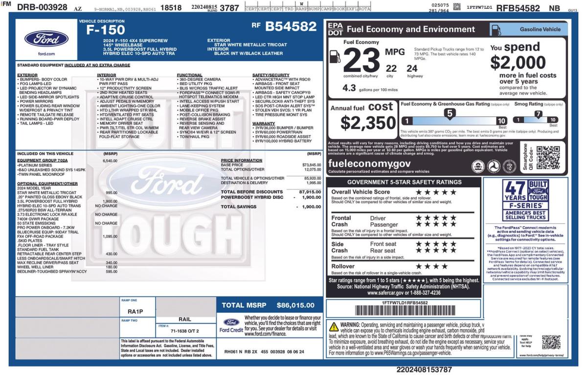 Elevate your driving experience with this exceptional 2024 Ford F-150 Platinum. Packed with cutting-edge technology and uncompromising capability, this truck is poised to redefine your expectations.- Apple CarPlay/Android Auto- FX4 Off-Road Package- Equipment Group 702A High- Radio: B&O Unleashed Sound System by Bang & Olufsen- Continuously Controlled Damping- Monotube Rear Shocks- Off-Road Tuned Front Shock Absorbers- Rock Crawl Mode- 4x4 FX4 Off-Road Bodyside Decal- Heads-Up Display- Tray Style Floor Liner- Navigation System: Connected Navigation- Hill Descent Control- Twin Panel MoonroofPowered by the remarkable 3.5L PowerBoost Full-Hybrid V6 engine, this F-150 Platinum delivers exceptional performance and efficiency, with an impressive 22 city and 24 highway MPG. Conquer any terrain with the advanced 4WD system and FX4 Off-Road Package, which includes skid plates, rock crawl mode, and more.Indulge in the ultimate in comfort and convenience with features like the Max Recline Driver & Passenger Seats, Heads-Up Display, and the premium B&O Unleashed Sound System. The Tough Bed Spray-In Bedliner and Retractable Rear Center Step ensure your F-150 Platinum is both stylish and practical.This exceptional truck is equipped with a wealth of advanced safety and driver-assist technologies, including Automatic Emergency Braking, Blind Spot Monitoring, and Lane Keeping Assist, giving you the confidence to tackle any journey.Experience the unparalleled capability, comfort, and technology of the 2024 Ford F-150 Platinum. Visit our showroom today and let us demonstrate how this remarkable truck can elevate your driving experience.