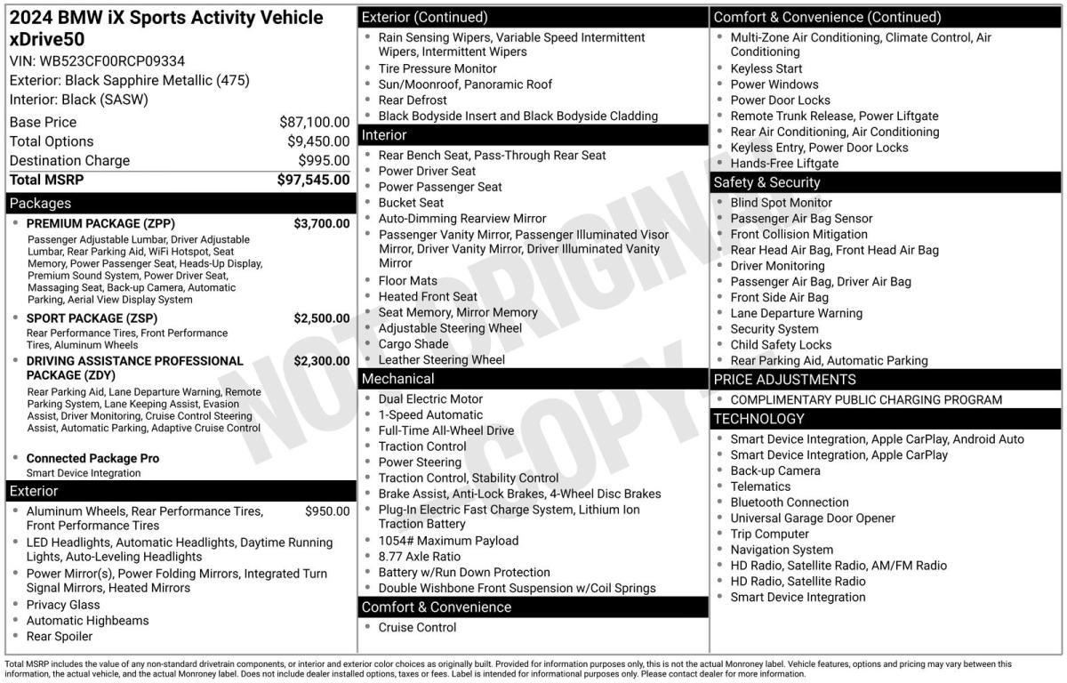 Elevate your driving experience with the exceptional 2024 BMW iX xDrive50. This all-electric SUV combines unparalleled performance, cutting-edge technology, and refined luxury, making it the ultimate choice for the discerning driver.Meticulously crafted with your driving pleasure in mind, the iX boasts an impressive array of features:- Wheels: 22" x 9.5" Aero Bi-Color (Style 1020)- Driving Assistance Professional Package, including Active Cruise Control, Traffic Jam Assistant, and Active Driving Assistant Pro- Premium Package, featuring a harman kardon Surround Sound System, Live Cockpit Pro, and Parking Assistant Plus- Sport Package, enhancing the vehicle's dynamic capabilitiesElevate your commute with the iX's exceptional performance. Powered by a state-of-the-art electric motor, this SUV delivers an impressive 83 MPGe in the city and 82 MPGe on the highway, ensuring exceptional efficiency and a reduced environmental impact.Step inside the iX and experience the epitome of modern luxury. The spacious and well-appointed cabin features Multi-Functional Seats with massage and memory functionality, as well as the Iconic Sounds Electric system that provides a captivating auditory experience. The Personal eSIM 5G and Interior Camera further enhance the vehicle's connectivity and convenience.Safety is paramount in the iX, with features like Active Lane Keeping Assistant, Parking Assistant Professional, and the Surround View with 3D View ensuring you navigate the roads with confidence. The Highway Assistant, a standout feature, allows for hands-off driving on limited access highways, providing a truly remarkable driving experience.Whether you're seeking uncompromising performance, cutting-edge technology, or refined luxury, the 2024 BMW iX xDrive50 is the answer. Experience the future of driving today and visit our showroom to take this exceptional SUV for a test drive. We're confident you'll be captivated by its exceptional capabilities and unwavering attention to detail.