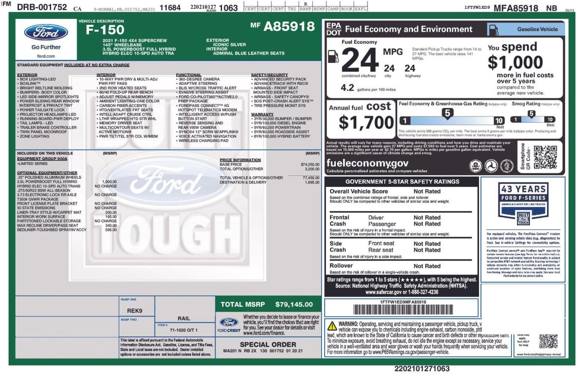 This 2021 Ford F-150 XLT SuperCrew blends modern capability with advanced hybrid performance, delivering a refined yet highly functional full-size pickup. Built on a 145-inch wheelbase and powered by the impressive 3.5L PowerBoost Full Hybrid engine paired to a smooth 10-speed automatic transmission, this truck offers strong efficiency and power, achieving an EPA-estimated 24 MPG combined. Finished in Iconic Silver and complemented by a premium Admiral Blue leather interior, this F-150 stands out with both durability and upscale comfort.Equipped with the 900A Equipment Group, this truck comes well-appointed with a host of standard features including LED box lighting, a power sliding rear window, running boards, dual-zone climate control, a 360-degree camera, Ford Co-Pilot360 2.0, and SYNC 4 with a 12-inch touchscreen. Interior highlights such as power-adjustable pedals with memory, heated front seats, and ambient lighting create a comfortable and connected driving experience, while functional upgrades like Pro Trailer Backup Assist and a trailer brake controller enhance towing confidence.What truly sets this F-150 apart are its carefully selected optional upgrades. The 3.5L PowerBoost Full Hybrid system not only improves fuel economy but also enhances torque delivery for demanding workloads. Riding on striking 22-inch polished aluminum wheels, this truck has a bold road presence, while the 3.73 electronic locking rear axle and FX4 Off-Road Package add serious off-road capability with skid plates and tuned suspension. Practical enhancements such as the tailgate step, partitioned lockable storage, and interior work surface increase everyday usability, making it as functional on the jobsite as it is comfortable on long drives.Additional premium touches include a twin-panel moonroof that floods the cabin with natural light, Max Recline front seats for ultimate relaxation, and a spray-in bedliner with tough bed spray for long-term durability. Safety and emissions-conscious buyers will also appreciate the 50-state emissions system.Altogether, this F-150 XLT PowerBoost offers a rare combination of hybrid efficiency, rugged capability, and upscale features, making it an exceptional choice for drivers who demand versatility without compromise.