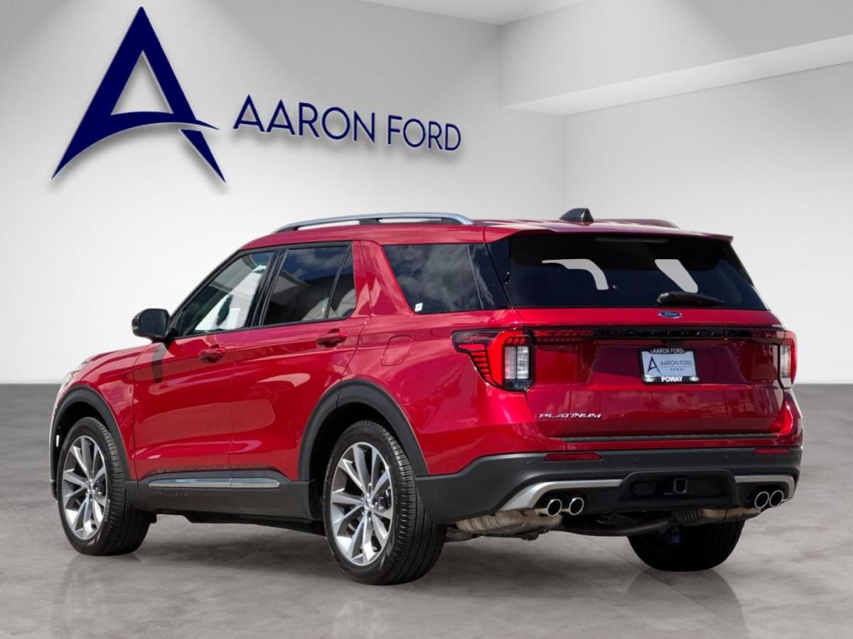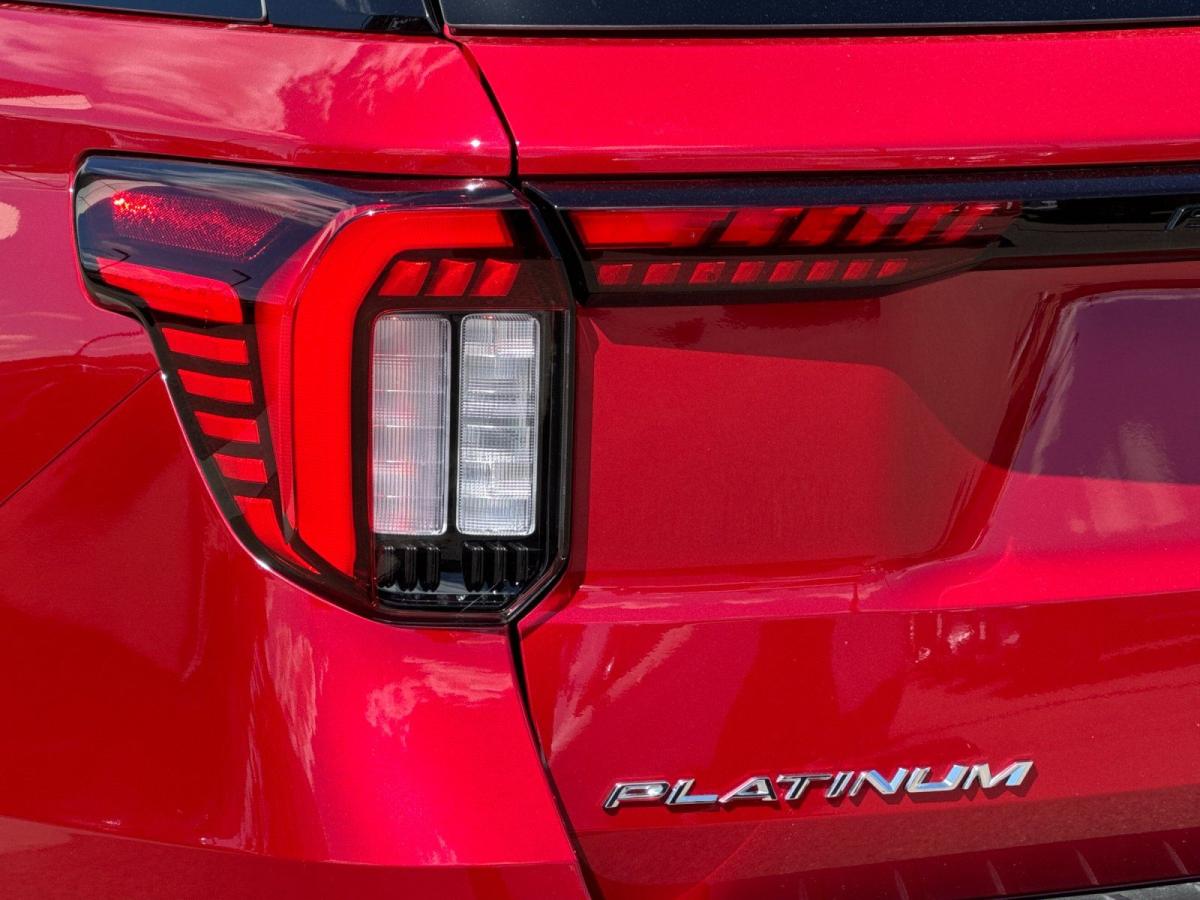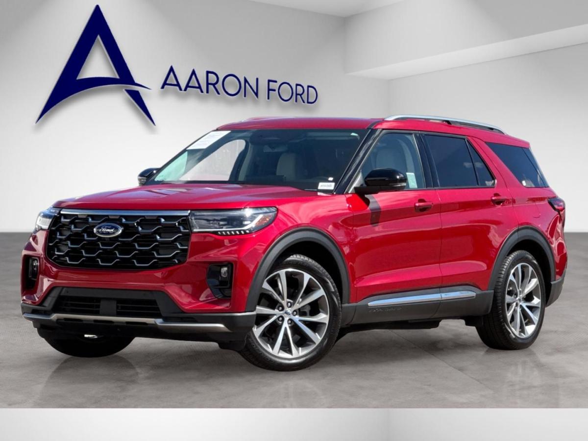 Experience premium comfort, advanced technology, and confident performance with this exceptionally equipped 2025 Ford Explorer Platinum RWD. Finished in eye-catching Rapid Red Metallic Tinted Clearcoat and complemented by a refined Crystal Gray leather interior, this Explorer delivers a perfect blend of sophistication and everyday versatility, setting itself apart in the full-size SUV segment.Under the hood, the powerful 3.0L EcoBoost V6 engine pairs seamlessly with a 10-speed automatic transmission, providing smooth, responsive performance whether you're commuting, traveling with family, or towing with ease. The Class III Trailer Tow Package further enhances its capability, making this Explorer as functional as it is luxurious.This Platinum model stands out with the highly desirable Ultimate Package, elevating the driving experience with premium upgrades and cutting-edge features. The exterior is enhanced by sleek 21-inch Dark Alloy aluminum wheels and satin-finish roof rack side rails, while practical touches like a hands-free power liftgate and rain-sensing wipers add everyday convenience.Inside, the cabin is designed to impress. Multi-contour heated and ventilated front seats with massage functionality, heated second-row seating, and a heated steering wheel ensure exceptional comfort for all passengers. The twin-panel moonroof brings in natural light, creating an open and airy feel throughout the interior. High-end finishes and the Lux Leather Package further reinforce the upscale atmosphere.Technology is at the forefront, featuring a large 13.2-inch touchscreen with SYNC 4A, a 12.3-inch digital instrument cluster, and a premium B&O sound system for an immersive listening experience. Wireless Apple CarPlay and Android Auto, integrated navigation, and a built-in Wi-Fi hotspot keep you seamlessly connected on the go.Safety and driver assistance are equally impressive, with Ford Co-Pilot360 Assist 2.0 offering features like adaptive cruise control, evasive steering assist, intersection assist, a 360-degree camera, and reverse brake assist. These systems work together to provide confidence and peace of mind for you and your passengers.With its powerful engine, upscale appointments, and standout packages like the Ultimate Package and Lux Leather Package, this 2025 Ford Explorer Platinum is the complete package for drivers who refuse to compromise. Its a refined, capable SUV designed to elevate every drive.
