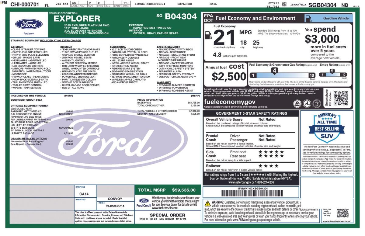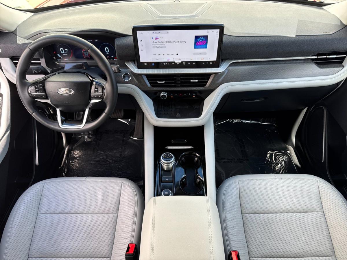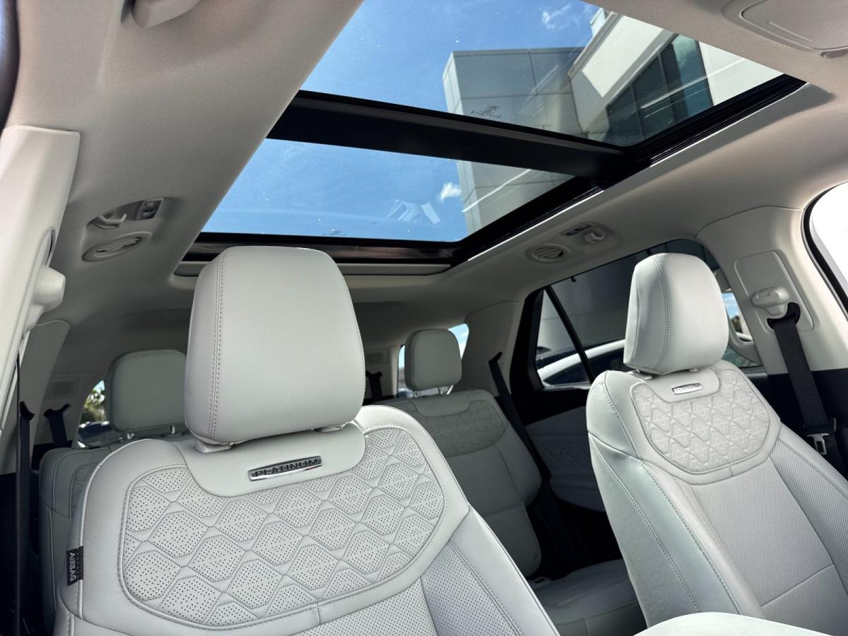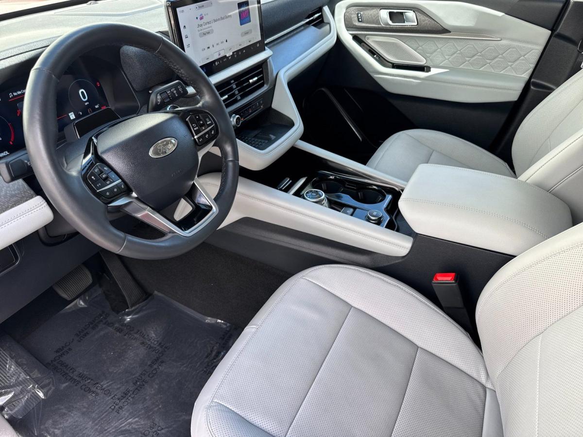 Experience premium comfort, advanced technology, and confident performance with this exceptionally equipped 2025 Ford Explorer Platinum RWD. Finished in eye-catching Rapid Red Metallic Tinted Clearcoat and complemented by a refined Crystal Gray leather interior, this Explorer delivers a perfect blend of sophistication and everyday versatility, setting itself apart in the full-size SUV segment.Under the hood, the powerful 3.0L EcoBoost V6 engine pairs seamlessly with a 10-speed automatic transmission, providing smooth, responsive performance whether you're commuting, traveling with family, or towing with ease. The Class III Trailer Tow Package further enhances its capability, making this Explorer as functional as it is luxurious.This Platinum model stands out with the highly desirable Ultimate Package, elevating the driving experience with premium upgrades and cutting-edge features. The exterior is enhanced by sleek 21-inch Dark Alloy aluminum wheels and satin-finish roof rack side rails, while practical touches like a hands-free power liftgate and rain-sensing wipers add everyday convenience.Inside, the cabin is designed to impress. Multi-contour heated and ventilated front seats with massage functionality, heated second-row seating, and a heated steering wheel ensure exceptional comfort for all passengers. The twin-panel moonroof brings in natural light, creating an open and airy feel throughout the interior. High-end finishes and the Lux Leather Package further reinforce the upscale atmosphere.Technology is at the forefront, featuring a large 13.2-inch touchscreen with SYNC 4A, a 12.3-inch digital instrument cluster, and a premium B&O sound system for an immersive listening experience. Wireless Apple CarPlay and Android Auto, integrated navigation, and a built-in Wi-Fi hotspot keep you seamlessly connected on the go.Safety and driver assistance are equally impressive, with Ford Co-Pilot360 Assist 2.0 offering features like adaptive cruise control, evasive steering assist, intersection assist, a 360-degree camera, and reverse brake assist. These systems work together to provide confidence and peace of mind for you and your passengers.With its powerful engine, upscale appointments, and standout packages like the Ultimate Package and Lux Leather Package, this 2025 Ford Explorer Platinum is the complete package for drivers who refuse to compromise. Its a refined, capable SUV designed to elevate every drive.