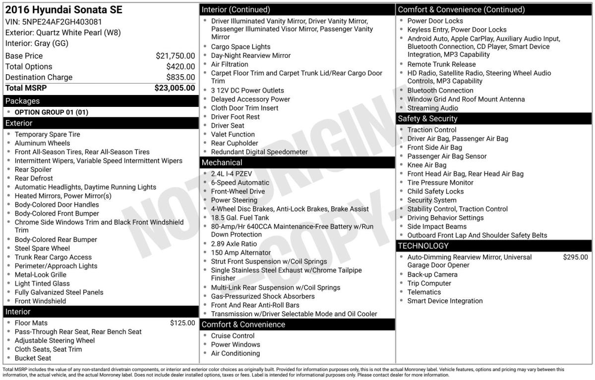 Discover the perfect balance of style, comfort, and efficiency in the 2016 Hyundai Sonata Base. This sophisticated sedan boasts a striking exterior design and a well-appointed interior that caters to your every need.- Carpeted Floor Mats- Electrochromatic Mirror with HomeLink and Compass- Option Group 01Powered by a 2.4L I4 DGI DOHC 16V PZEV engine, the Sonata delivers an impressive 185 horsepower and an exceptional fuel economy of 25 city/38 highway MPG, making it an ideal choice for both your daily commute and weekend adventures.Inside, you'll find a wealth of features that enhance your driving experience, including:- 6 Speakers- AM/FM radio with SiriusXM- CD player- Air Conditioning- Rear Window Defroster- Power Windows and Locks- Remote Keyless Entry- Steering Wheel Mounted Audio Controls- Speed Control- Four Wheel Independent Suspension- Electronic Stability ControlThe Sonata's thoughtfully designed cabin offers ample space and comfort, with features like the Carpeted Floor Mats, Front Center Armrest, and YES Essentials Premium Cloth Seating Surfaces providing a refined and relaxing environment.Safety is also a top priority, with the Sonata boasting advanced features such as Dual Front Airbags, Dual Front Side Impact Airbags, Overhead Airbag, and a Panic Alarm, ensuring your peace of mind on every journey.Discover the perfect balance of style, performance, and technology in the 2016 Hyundai Sonata Base. Experience the difference for yourself and schedule a test drive today. We're confident you'll be impressed by this exceptional sedan.