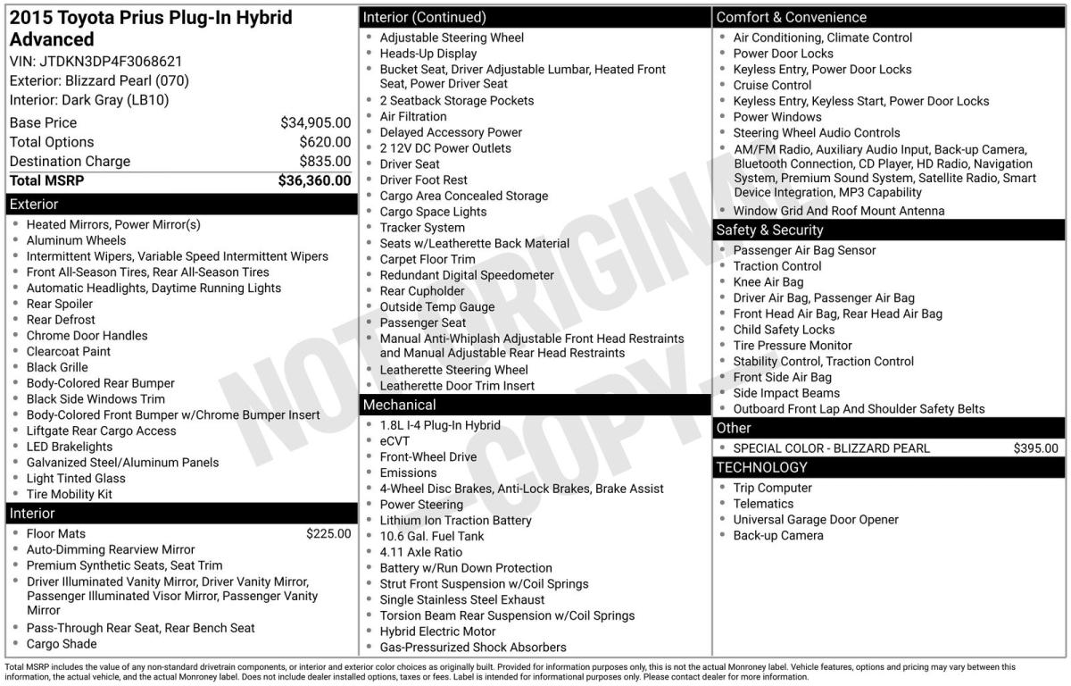 Discover the Pinnacle of Hybrid Driving with the 2015 Toyota Prius Plug-in AdvancedElevate your commute and embrace the future of sustainable mobility with the exceptional 2015 Toyota Prius Plug-in Advanced. This cutting-edge hybrid masterpiece seamlessly blends advanced technology, exceptional efficiency, and refined sophistication, making it the ideal choice for the discerning driver seeking a truly remarkable driving experience.- Special Color - Blizzard Pearl- Carpet Floor Mats & Carpet Cargo MatMeticulously engineered to redefine the standards of hybrid performance, the Prius Plug-in Advanced boasts a robust 1.8L 4-Cylinder DOHC 16V VVT-i engine that delivers exceptional power and efficiency, paired with a smooth and responsive CVT transmission. Equipped with a state-of-the-art hybrid system, this remarkable vehicle offers the perfect blend of electric and gasoline-powered propulsion, ensuring you can tackle your daily commute with unparalleled confidence and environmental responsibility.Indulge in the cutting-edge features that elevate the Prius Plug-in Advanced to new heights of sophistication and convenience. Enjoy the seamless integration of the Navigation System, the convenience of the Exterior Parking Camera Rear, and the comfort of the Heated Front Bucket Seats. Immerse yourself in the premium audio experience with the AM/FM radio: SiriusXM and CD player, while staying connected and in control with the Steering Wheel Mounted Audio Controls.Safety is paramount, and the Prius Plug-in Advanced delivers with a comprehensive suite of advanced safety technologies. Benefit from the peace of mind provided by the ABS brakes, Dual Front Impact Airbags, Dual Front Side Impact Airbags, and the Occupant Sensing Airbag. Experience the added confidence of the Electronic Stability Control and Traction Control systems, ensuring a secure and responsive driving experience in any conditions.Designed with the discerning driver in mind, the Prius Plug-in Advanced seamlessly blends style and substance. Its sleek and aerodynamic exterior, accentuated by the Spoiler and Heated Door Mirrors, not only enhances its visual appeal but also contributes to its exceptional fuel efficiency. Step inside and indulge in the refined cabin, where the Tilt and Telescoping Steering Wheel, Illuminated Entry, and Overhead Console create an environment of unparalleled comfort and convenience.As you embark on your journey with the 2015 Toyota Prius Plug-in Advanced, you'll be making a statement about your commitment to sustainability and your desire for a driving experience that is truly extraordinary. Visit our showroom today and let us demonstrate why this remarkable hybrid is the perfect addition to your lifestyle.