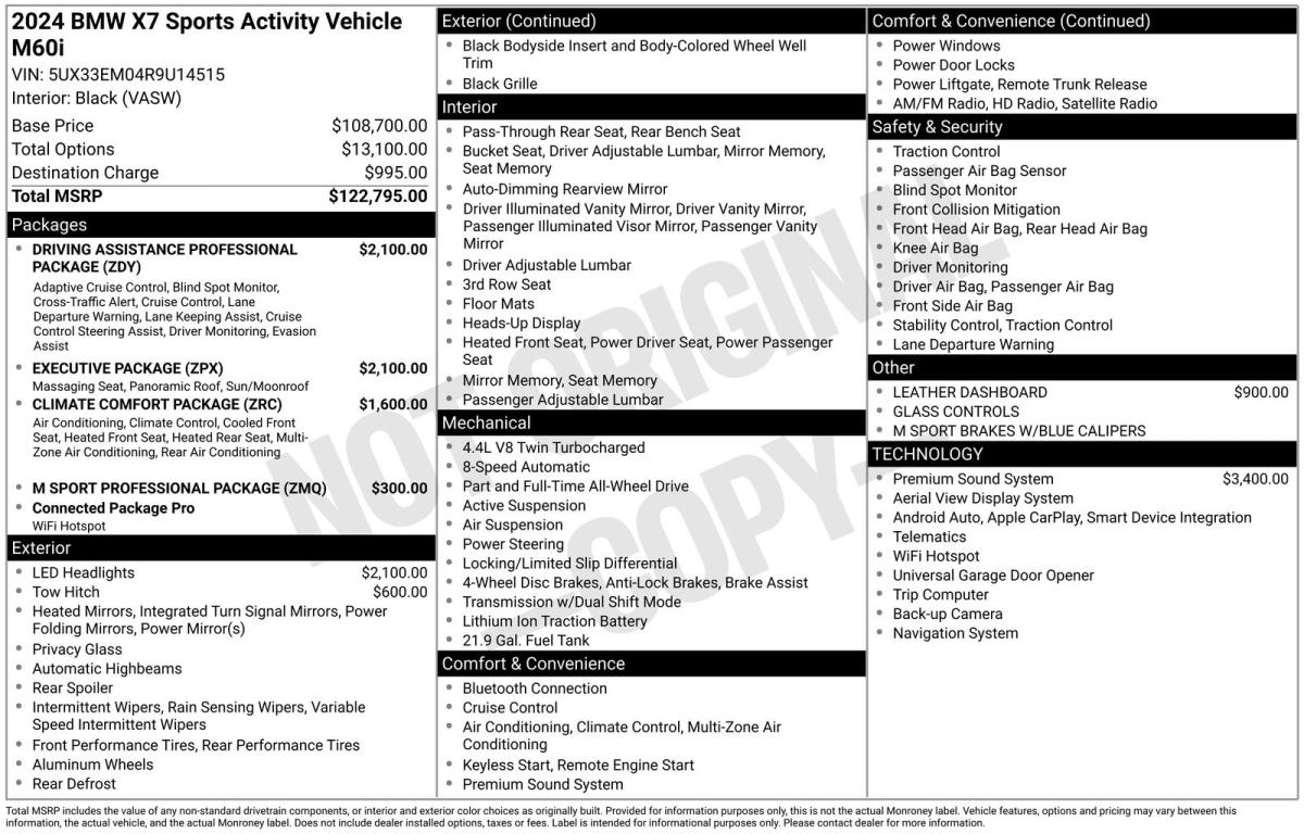 Experience the epitome of luxury and performance with this stunning 2024 BMW X7 M60i. This exceptional SUV boasts a captivating blend of power, sophistication, and cutting-edge technology that will elevate your driving experience to new heights.- Trailer Hitch- Crystal Headlights- Leather Dashboard- Bowers & Wilkins Diamond Surround Sound System- Driving Assistance Professional Package- M Sport Professional Package- Executive Package- Climate Comfort PackageUnder the hood, this X7 M60i is powered by a remarkable 4.4L V8 DOHC 32V engine, delivering an exhilarating 523 horsepower and 553 lb-ft of torque. Paired with an 8-speed Automatic Sport transmission and BMW's renowned xDrive all-wheel-drive system, this SUV offers a thrilling and confident driving dynamics, whether navigating city streets or exploring open roads.Stepping inside, you'll be greeted by a cabin that exudes premium craftsmanship and attention to detail. The Extended Merino Leather Upholstery, Heated and Ventilated Front Seats, and Panoramic Sky Lounge LED Roof create an opulent and inviting atmosphere, while the Bowers & Wilkins Diamond Surround Sound System provides an immersive audio experience.The Driving Assistance Professional Package takes your safety and convenience to the next level, with features like Active Driving Assistant Pro, Active Cruise Control with Stop & Go, Traffic Jam Assistant, and Highway Assistant, which allows for hands-off driving up to 85 mph on limited-access highways. The M Sport Professional Package further enhances the driving dynamics with M Sport Brakes, Extended Shadowline Trim, and more.Designed to impress, this 2024 BMW X7 M60i is a true testament to the brand's commitment to engineering excellence. With its stunning Black exterior, powerful performance, and unparalleled luxury features, this SUV is poised to exceed your expectations and elevate your driving experience to new heights.We invite you to experience the exceptional craftsmanship and capabilities of this 2024 BMW X7 M60i firsthand. Schedule a test drive today and discover the ultimate in luxury and performance.
