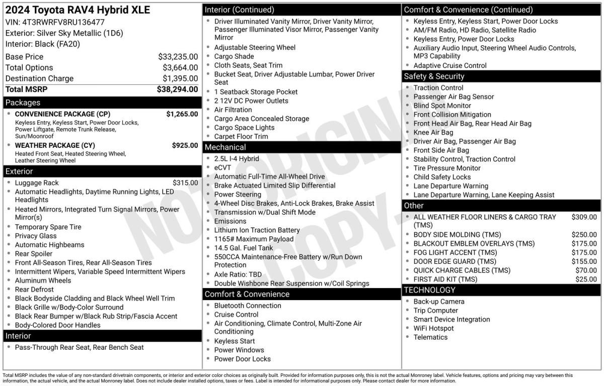 Discover the exceptional 2024 Toyota RAV4 Hybrid XLE, a versatile and eco-friendly SUV that seamlessly blends style, performance, and advanced technology. With its striking Silver exterior and a meticulously crafted interior, this RAV4 Hybrid is poised to elevate your driving experience.- Fog Light Accent (TMS)- All Weather Floor Liners & Cargo Tray (TMS)- Blackout Emblem Overlays (TMS)- Roof Rack Cross Bars (TMS)- First Aid Kit (TMS)- Quick Charge Cables (TMS)- Body Side Molding (TMS)- Convenience Package: Tilt & Slide Moon Roof, Front Door Smart Key System w/Push Button Start, Remote Keyless Entry, and Power Liftgate w/Jam Protection- Weather Package: Front Seat Heating, Heated 3-Spoke Leather Steering Wheel- Door Edge Guard (TMS)Powered by a robust 2.5L 4-Cylinder engine and an eCVT transmission, this all-wheel-drive RAV4 Hybrid delivers an exceptional blend of power and efficiency, boasting an impressive 41 MPG in the city and 38 MPG on the highway. Experience the seamless integration of technology and convenience with features like the Tilt & Slide Moon Roof, Front Door Smart Key System with Push Button Start, Front Seat Heating, and Heated 3-Spoke Leather Steering Wheel.Versatility is at the heart of this RAV4 Hybrid, with ample cargo space and a spacious interior that can accommodate your active lifestyle. Whether you're embarking on a weekend getaway or navigating the daily commute, this SUV is designed to provide a comfortable and connected driving experience.At our dealership, we take pride in offering a diverse selection of high-quality vehicles tailored to meet the needs of discerning customers like yourself. The 2024 Toyota RAV4 Hybrid XLE is a testament to our commitment to providing exceptional value and uncompromising performance.We invite you to visit our showroom and experience the exceptional 2024 Toyota RAV4 Hybrid XLE for yourself. Our knowledgeable sales team is ready to assist you in exploring the features and capabilities of this remarkable SUV, and to help you find the perfect vehicle to suit your lifestyle. We're confident that once you take this RAV4 Hybrid for a test drive, you'll be captivated by its blend of style, efficiency, and advanced technology.