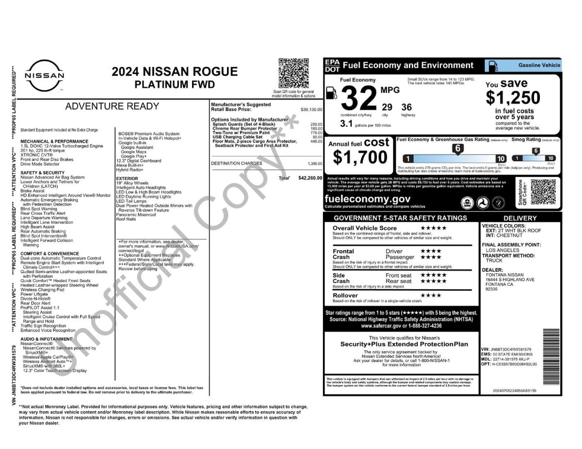 Discover the epitome of modern SUV elegance with the 2024 Nissan Rogue Platinum. This remarkable vehicle seamlessly blends style, technology, and performance, making it the perfect companion for your adventures.Meticulously crafted with your needs in mind, the 2024 Rogue Platinum boasts an impressive array of features:- Chrome Rear Bumper Protector- Floor Mats w/2-Piece Cargo Area Protector- Splash Guards (Black - Set of 4)- USB Charging Cable Set - Nissan- Navigation system: NissanConnect with Navigation and ServicesStep inside and experience the unparalleled comfort of the Rogue Platinum's luxurious cabin, featuring Quilted Semi-Aniline Leather-Appointed Seat Trim, Heated Front Bucket Seats, and a Bose Premium Audio System that will elevate your driving experience.The Rogue Platinum's striking exterior commands attention with its bold, sculpted lines and 19" Unique Dark Painted Aluminum Alloy wheels. The Power Liftgate and Auto High-beam Headlights add both convenience and style, ensuring your journeys are seamless and secure.Beneath the sleek exterior lies a powerful 1.5L DOHC engine, paired with a CVT with Xtronic transmission and Front-Wheel Drive, delivering an impressive balance of power and efficiency. With a city MPG of 29 and a highway MPG of 36, the Rogue Platinum offers the perfect blend of performance and fuel economy.The Rogue Platinum's advanced safety features, including Brake Assist, Electronic Stability Control, and a comprehensive airbag system, provide you and your loved ones with the peace of mind you deserve. Additionally, the NissanConnect Services emergency communication system ensures you're always connected and protected.Experience the ultimate in luxury, technology, and performance with the 2024 Nissan Rogue Platinum. Visit our showroom today and let us demonstrate why this exceptional SUV is the perfect choice for your next adventure.