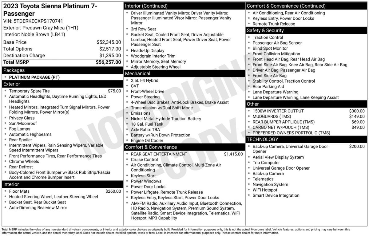 Experience the ultimate in family-friendly luxury with the 2023 Toyota Sienna Platinum 7 Passenger. This exceptional minivan offers a captivating blend of advanced technology, premium comfort, and unparalleled versatility, making it the perfect choice for discerning buyers seeking the ultimate in automotive excellence.Boasting a sleek and sophisticated exterior in a stunning Gray hue, the Sienna Platinum exudes a sense of refined elegance. Under the hood, the powerful 2.5L I4 engine, paired with a seamless CVT transmission and Front-Wheel Drive, delivers exceptional efficiency, with an impressive 36 MPG in both the city and on the highway.- 1500W Inverter Output- Rear Seat Entertainment- Intelligent Inside Rear View Mirror with HomeLink- Mudguards (TMS)- T155/80R17 Temporary Spare TireStep inside the Sienna Platinum and be captivated by the luxurious cabin, featuring premium leather seating, heated and ventilated front seats, and a 12-speaker JBL audio system with navigation. The Intelligent Inside Rear View Mirror and Heads-Up Display provide enhanced visibility and convenience, while the 120V AC outlets and 1500W inverter output offer versatile power options for all your on-the-go needs.The Sienna Platinum's advanced safety features, including Lane Departure Warning, Automatic High Beams, and a Rear-View Camera with Wide Angle Backup Monitor, provide peace of mind and confidence on the road. With seating for up to 7 passengers and ample cargo space, this exceptional minivan is the perfect companion for family adventures, weekend getaways, and everything in between.Discover the unparalleled combination of style, technology, and functionality that the 2023 Toyota Sienna Platinum 7 Passenger has to offer. Experience the ultimate in family-friendly luxury by scheduling a test drive at our dealership today. We're confident that once you experience the Sienna Platinum, you'll never settle for anything less.