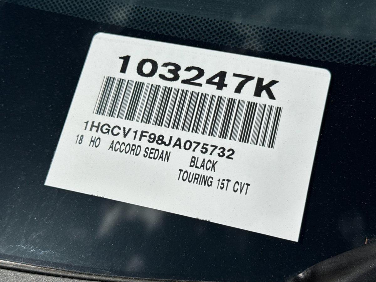 Discover the perfect blend of style, technology, and performance in this stunning 2018 Honda Accord Touring. This exceptional sedan boasts a captivating exterior in a sleek Black finish, complemented by a refined and well-appointed interior that exudes sophistication.Elevate your driving experience with a host of premium features, including:- Heads-Up Display- Memory Seat- Blind Spot Information (BSI) System- Adaptive Suspension- Leather-Trimmed Seats- Heated and Ventilated Front Seats- Heated Rear Seats- Power Moonroof- 19" Machine-Finished Alloy WheelsThe Accord Touring is powered by a turbocharged 1.5-liter DOHC 16-valve VTEC engine, delivering an impressive balance of power and efficiency with an EPA-estimated 29 MPG in the city and 35 MPG on the highway. Paired with a smooth-shifting CVT transmission, this Honda provides a dynamic and responsive driving experience that will captivate you every time you get behind the wheel.Elevate your daily commute or weekend getaway with the advanced technology features of the Accord Touring. Enjoy the seamless integration of Apple CarPlay and Android Auto, as well as the premium 450-Watt AM/FM/HD audio system that will immerse you in your favorite music. The Heads-Up Display keeps critical information right in your line of sight, while the Blind Spot Information System provides an added layer of safety and confidence on the road.Comfort and convenience are paramount in the Accord Touring, with dual-zone automatic climate control, a power driver's seat with memory function, and a leather-wrapped steering wheel and shift knob. The spacious interior offers ample room for passengers and cargo, ensuring a comfortable and versatile driving experience.Safety is also a top priority, with the Accord Touring boasting a comprehensive suite of advanced safety features, including Collision Mitigation Braking, Lane Keeping Assist, and Adaptive Cruise Control. These cutting-edge technologies work together to help protect you and your loved ones on every journey.Discover the exceptional blend of style, technology, and performance that the 2018 Honda Accord Touring has to offer. Visit our showroom today to experience this remarkable sedan firsthand and see how it can elevate your driving experience.