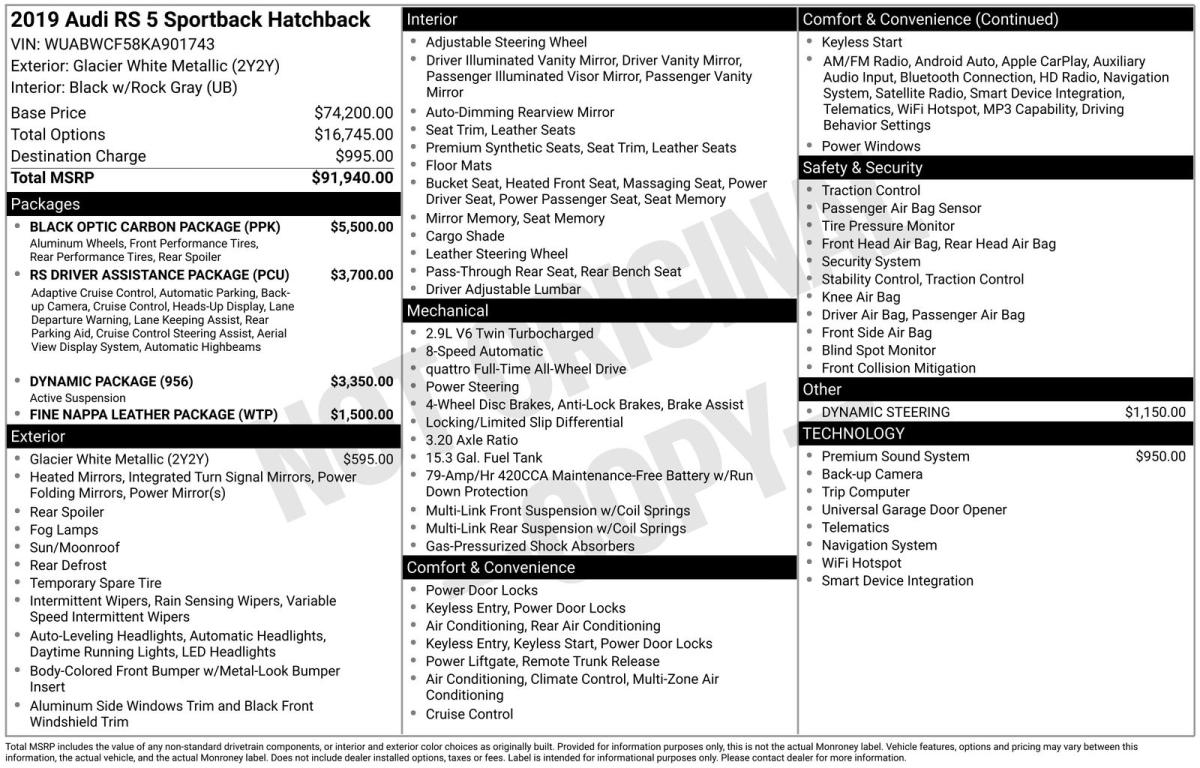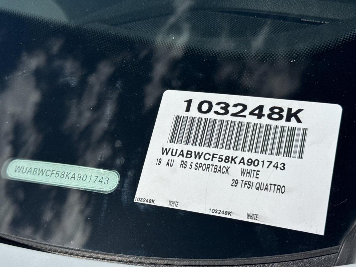 Experience the pinnacle of performance and sophistication with this exceptional 2019 Audi RS 5 2.9T quattro. This sleek and powerful sports coupe is a true masterpiece of German engineering, designed to thrill the senses and elevate your driving experience.- Dynamic Steering- Glacier White Metallic exterior- Dynamic Package- Bang & Olufsen Sound System with 3D Sound- RS Driver Assistance Package- Black Optic Carbon Package- Fine Nappa Leather Package- Carbon Front Blade- Head-Up Display- Adaptive Cruise Control with Traffic Jam Assist- High-Beam Assistant- Carbon Exterior Side Mirror Housings- Carbon Rear Lip Spoiler- High Gloss Black Exterior Kit with quattro Script- RS Sport Exhaust System with Black Tips- RS Sport Suspension Plus with Dynamic Ride ControlBeneath the sculpted exterior lies a heart-pounding 2.9L TFSI 6-cylinder engine that delivers an exhilarating 444 horsepower and 443 lb-ft of torque. Paired with an 8-speed Tiptronic transmission and Audi's renowned quattro all-wheel-drive system, this RS 5 offers unparalleled performance, handling, and control, whether you're carving through twisty roads or cruising the highway.The Audi RS 5 is more than just a high-performance machine; it's a true work of art. The sleek, aerodynamic design is complemented by a stunning Glacier White Metallic exterior, while the Black Optic Carbon Package adds an extra touch of menacing style with carbon fiber accents and 20-inch forged alloy wheels.Step inside the cabin, and you'll be greeted by a world of luxury and technology. The Fine Nappa Leather Package envelops you in sumptuous, high-quality materials, while the Bang & Olufsen Sound System with 3D Sound delivers an immersive audio experience. The RS Driver Assistance Package, featuring cutting-edge safety and convenience features like Adaptive Cruise Control, Head-Up Display, and Audi Active Lane Assist, ensures you'll enjoy a confident and connected driving experience.This 2019 Audi RS 5 2.9T quattro is a true masterpiece of automotive engineering, blending uncompromising performance, stunning design, and premium luxury. Experience the thrill of owning one of the most desirable sports coupes on the market. Visit our showroom today and let us demonstrate why this exceptional vehicle deserves a place in your garage.