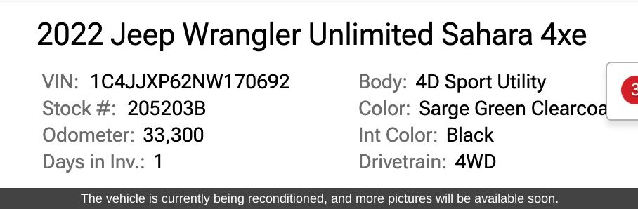 The Price you See is the Price you pay !!! No Games no Forced extras. Transparency is key , come see us for your next car.- Sarge Green Clearcoat exterior color- Premium Tan Sunrider Soft Top- Quick Order Package 29PThis 2022 Jeep Wrangler Unlimited Sahara 4xe is a true off-road icon, blending legendary capability with advanced hybrid technology. Powered by a 2.0L I4 DOHC engine paired with an 8-speed automatic transmission, this 4x4 Wrangler delivers exceptional performance and efficiency, with an estimated MPGe rating that will impress eco-conscious drivers.The Sahara trim level elevates the Wrangler experience with a host of premium features, including a navigation system, ParkView rear backup camera, and Apple CarPlay/Android Auto integration. The stunning Sarge Green Clearcoat exterior is complemented by the Premium Tan Sunrider Soft Top, creating a bold and distinctive look that's sure to turn heads on the trail or in the city.Inside, the Wrangler Unlimited Sahara 4xe offers a spacious and well-appointed cabin, with comfortable Premium McKinley Trimmed Seats, dual-zone automatic climate control, and a premium audio system with 9 speakers. Thoughtful touches like the leather-wrapped steering wheel, tilt/telescoping steering column, and integrated roll-over protection ensure both comfort and safety.Elevate your off-road adventures with the uncompromising capability of the 2022 Jeep Wrangler Unlimited Sahara 4xe. With its powerful hybrid powertrain, premium features, and exceptional versatility, this Wrangler is the perfect companion for those who demand the best in both performance and efficiency.This is a Lemon Law Buyback vehicle. No hidden fees. All reconditioning costs are fully included in our pricing. This vehicle was repurchased by the manufacturer and is offered at a discounted price. Most vehicles include a 12-month manufacturer warranty—see below for additional details.The manufacturer repurchased this vehicle due to a complaint from the original owner. Although the issue has been resolved, the vehicle is classified as a Manufacturer Buyback. All applicable manufacturer warranties remain in effect, and extended warranties are available.
